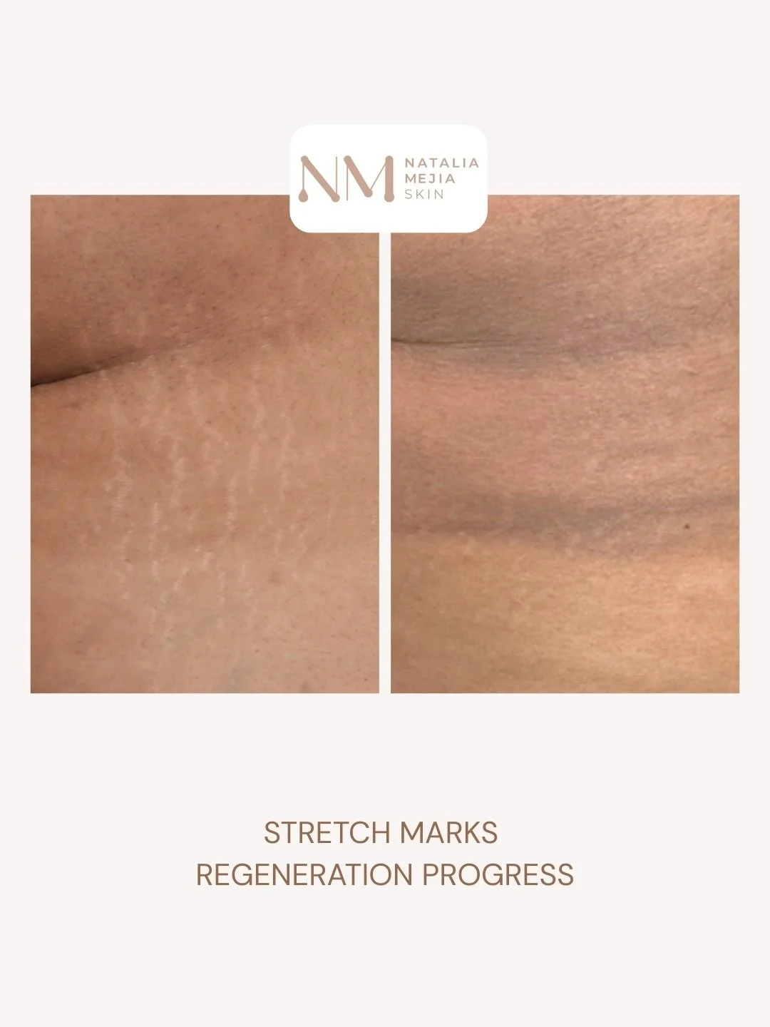 Our Stretch Mark Regeneration or Rejuvenation service employs a blend of natural serums, stem cells, exosomes, needling, and organic peels to target each stretch mark individually. This approach improves and regenerates both texture and color, especially for deeper and wider marks, promoting cell turnover and fibroblast reconstruction. Results can range from a 20% to 80% reduction in appearance. If your type of stretch marks qualify, we finish with camouflage techniques to enhance the treated